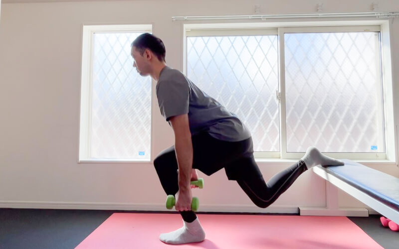 ブルガリアンスクワットとは、片脚をベンチや椅子などに乗せ、片脚でスクワット動作を行うトレーニングです。
