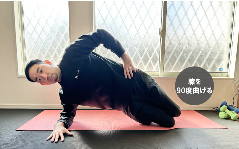 先ほどご紹介した基本のサイドプランクは、初心者の方にとって辛いと感じる方も多いため、負荷を下げて行うサイドプランクをご紹介します。