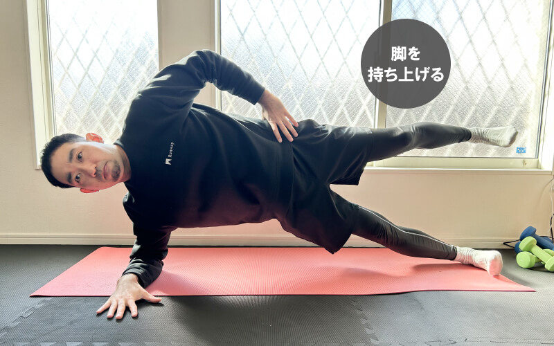 基本のサイドプランクで余裕がでてきた、中〜上級者向けに片足上げサイドプランクをご紹介します。